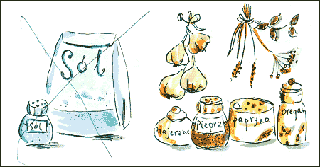 Próbować ziół. Często odruchowo sięgamy po sól, zapominając o przyprawach takich, jak: bazylia, estragon, oregano, tymianek, odmiany pieprzu, a nawet bezsolne mieszanki przypraw. Potrafią one nadać nowego, smacznego wymiaru, a przy okazji pomogą ograniczyć spożycie soli.